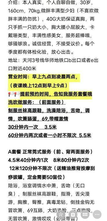今天约了安妮老师玩菊花三通,两次900,这个价格还是超级划算,地方也很好找,3号线地铁往天河客运站方向,在华师地铁口b出口走出来400米就到了,这位置在大马路上,停车场在隔壁银汇大厦停车场入口,老师来之前介绍的很清楚。按老师电话遥控指挥上楼,一开门就看到超级大的两个大奶子露在外面,胸控人爱死了,两只手抓不完一个奶,40G奶名不虚传,还很挺不下垂。交款洗澡之后,老师性格还是很温柔,服务比较细致,指滑弄的背痒痒的,漫游从耳朵一直到小腿,做毒龙舔到菊花里面了,围着一圈好爽一下刺激我。倒挂金钩时候,吹箫没点耐力差点射了